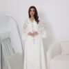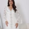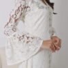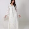 فستان أنثوي راقٍ باللون الأبيض، مصنوع من قماش الدانتيل الفاخر المزدان بنقوش زهرية أنيقة تمنحه طابعًا ناعمًا ورومانسيًا. يتميز بياقة على شكل V مزينة بتطريزات يدوية فاخرة من الخرز والكريستال اللامع تمتد على طول الفستان في خط عمودي يضفي لمسة فاخرة وجاذبية أنيقة.